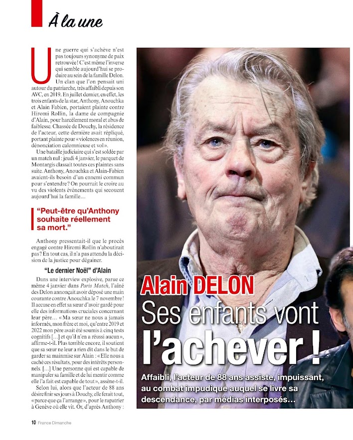 ESTE 13 DE FEBRERO LLEGA ANOUCHKA, corre a ver a Alain Delon, ese hombre al que adora, del que repite todo el tiempo: a él le debe todo. “Cuando llego, se enciende. Se levanta de la cama, se perfuma, almorzamos. ¡Aún lo encuentro tan hermoso! Sus ojos azules lo adornan". Entre ellos, es una loca historia de amor. “Sé que mi padre, con la infancia que tuvo, no sabía cómo tratar con sus hijos. Fui testigo de escenas violentas cuando éramos niños. Yo estuve allí, yo también era una niña. Entiendo el dolor. Muchas veces he intentado intervenir. Creo que mi padre sabía ser Alain Delon mejor que él mismo. No lo culpo, hizo lo que pudo. Pero no tengo que pagar por eso. Anthony y Alain-Fabien nunca tuvieron el valor de afrontarlo cara a cara. Ahora que ha disminuido, vienen a por mí. Vengarse de una mujer es más fácil. Al fin y al cabo, todo es cuestión de ego". Sin embargo, almuerzan todos juntos: “Alain-Fabien”, continúa, “no puedo negar que se ocupa de nuestro padre ahora que vive aquí. 'Alain Delon." Yo estoy pasando por un momento difícil. Intenté ayudar a Alain-Fabien, era cercano a él, es mi hermano pequeño, le pagué el alquiler durante varios meses... Y me grabó sin mi conocimiento